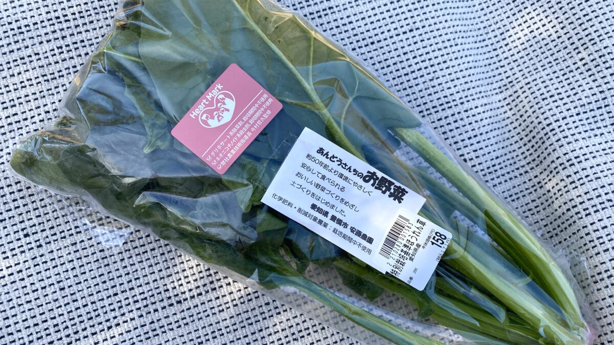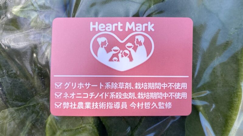 この特別栽培基準ほうれん草を購入した「サンヨネ」では、サンヨネ独自の基準を満たした商品に、このハートマークが貼られるらしい。