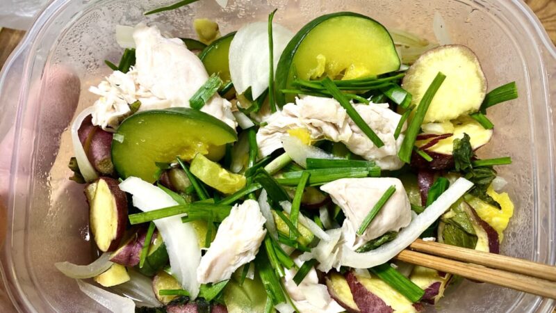 それらと鶏肉をタッパーに入れて、宿の電子レンジでチン。