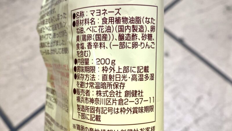 創健社の有精卵マヨネーズの成分表示。