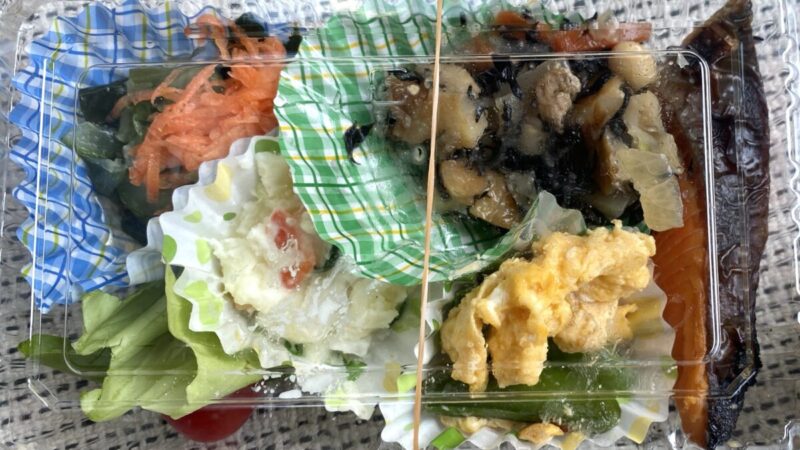 お惣菜の中身は、焼き鮭、大豆の煮物、炒り卵、ポテトサラダ、きゅうりとわかめの酢の物、レタスとミニトマト、など。