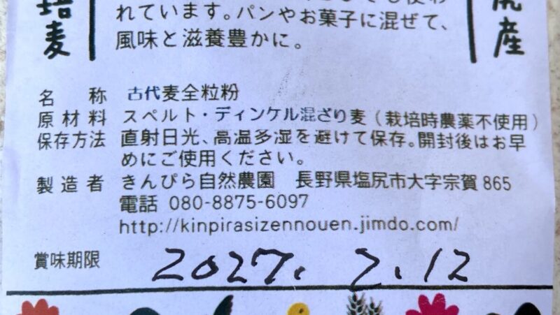 きんぴら自然農園 古代麦全粒粉の原材料表示↑