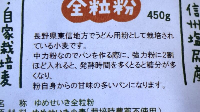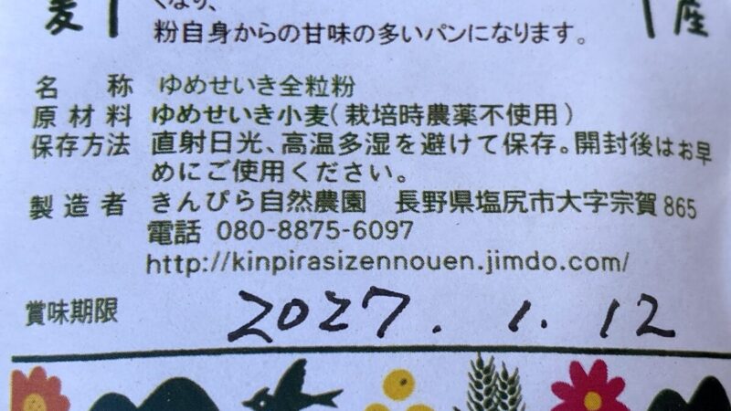 きんぴら自然農園 ゆめせいき全粒粉の原材料表示↑