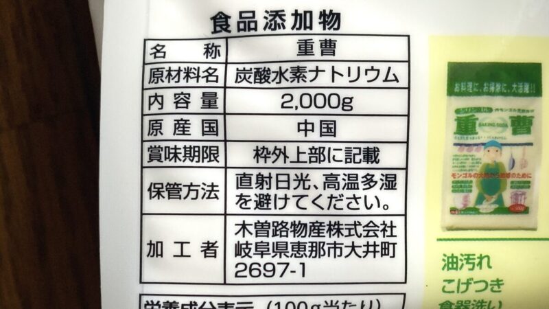 木曽路物産「シリンゴル重曹」の成分表示↑
