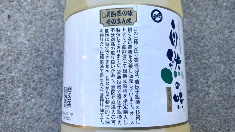また、遺伝子組み換えでない菜種で作ってるけど、流通段階で混じっちゃう可能性がなきにしもあらず…みたいなことも書いてある。