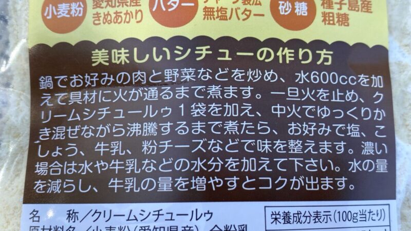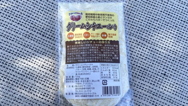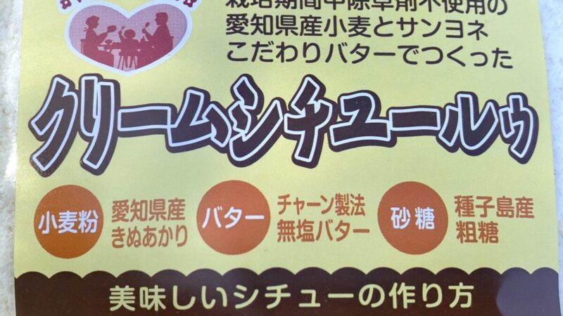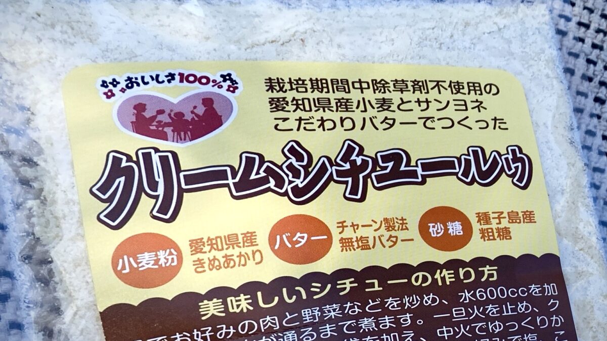豊橋のスーパー サンヨネで、「栽培期間中除草剤不使用の愛知県産小麦とサンヨネこだわりバターでつくったクリームシチュールゥ」なるものを買った。