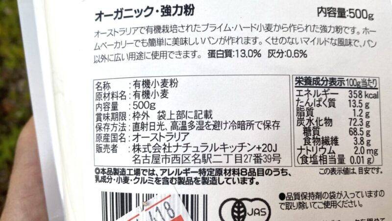 オーガニック強力粉の成分表示。