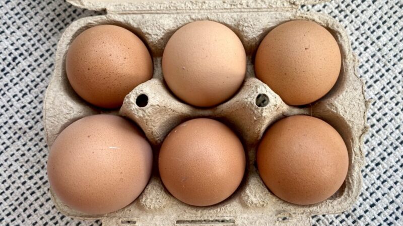 大きさも色もバラバラの平飼い卵が、6個並んでいる。