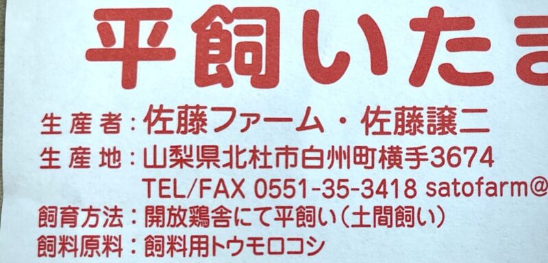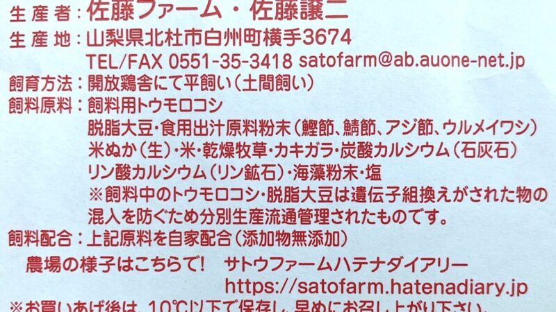 「佐藤ファームのおいしい平飼いたまご」の、原料等表示↑