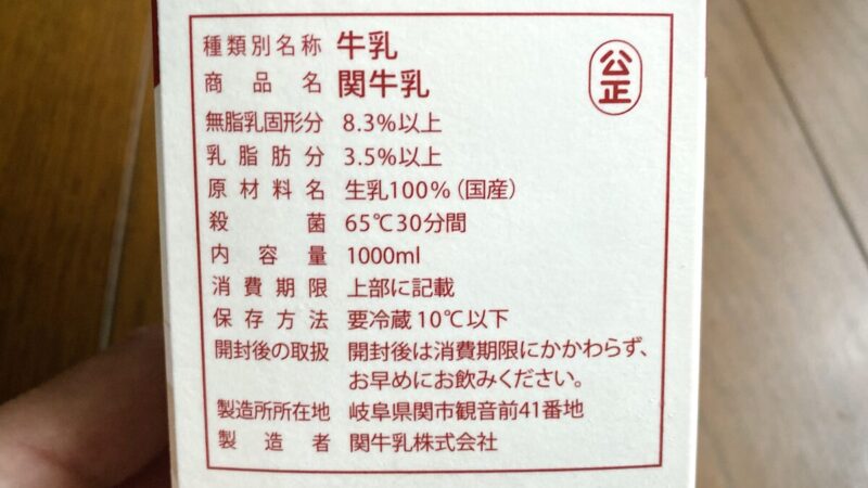 関牛乳のパッケージ裏面↑