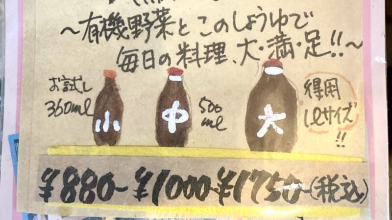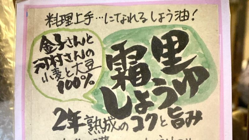 ↑この霜里しょうゆを購入した、埼玉県小川町の「有機野菜食堂わらしべ」さんにあったPOP
