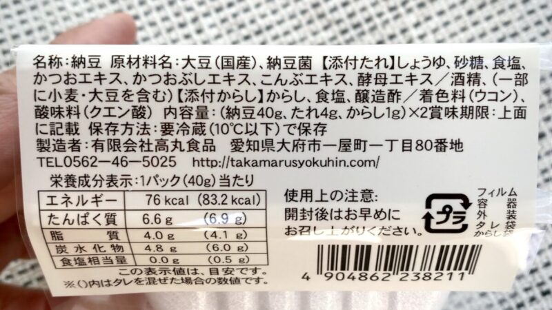 高丸食品「愛知県産大豆フクユタカ中粒納豆」の原材料表示↑
