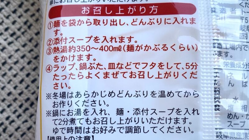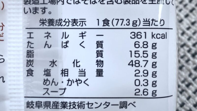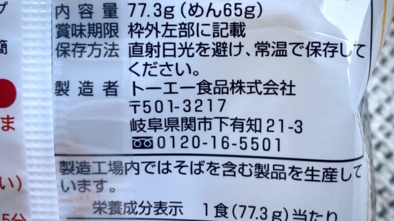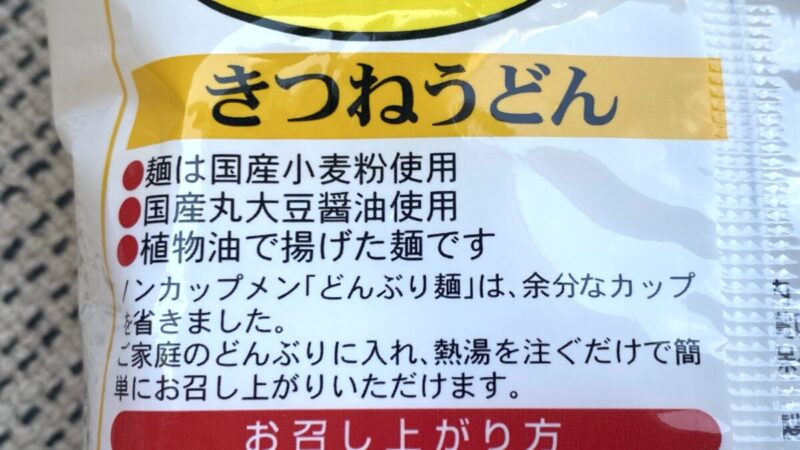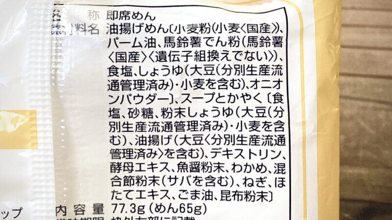 油揚げめん〔小麦粉(小麦<国産>)、パーム油、馬鈴薯でん粉(馬鈴薯<国産><遺伝子組み換えでない>)、食塩、しょうゆ、オニオンパウダー〕