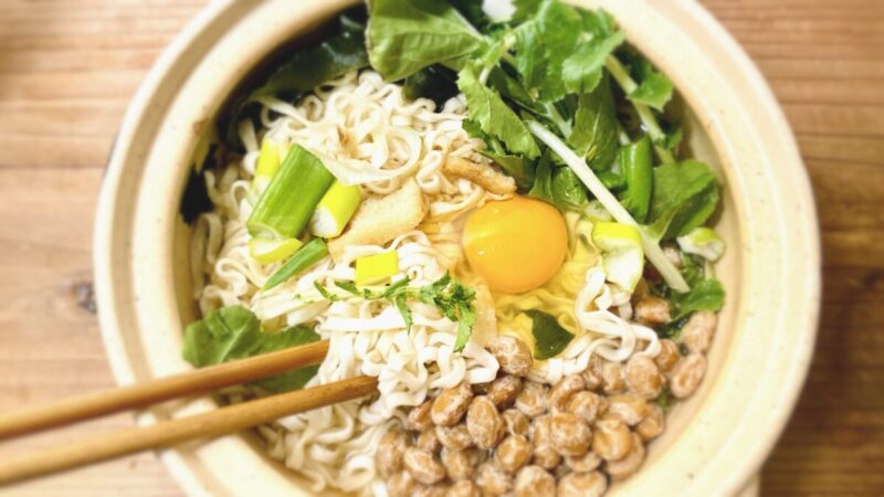 ちょっと寂しかったので、庭の畑で採れた野菜や、無農薬ねぎ、納豆、平飼い卵などを乗せた。