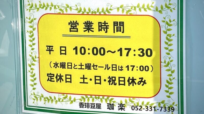 ワダコーヒーさんの小売店「香琲豆屋 珈楽」の営業時間↑