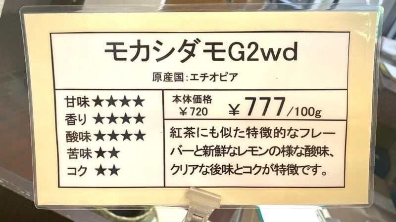 原産国や価格、その豆の特徴などがよく分かる。